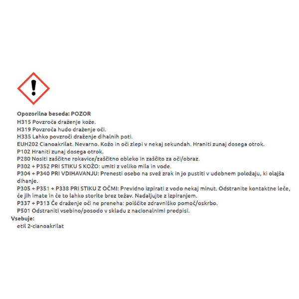 Podrobnejši opis Univerzalno vodoodporno sekundno cianoakrilatno lepilo za hitro lepljenje umetnih snovi, kovin, gume, keramike, usnja, lesa, plute in ostalih materialov. Primerno za notranjo in zunanjo uporabo.